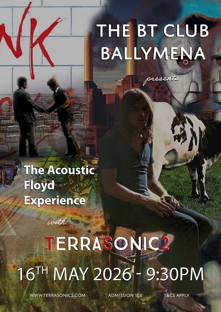 Join us for an unforgettable evening of musical magic as TerraSonic2 presents the Acoustic Floyd Experience. Immerse yourself in the timeless sounds of Pink Floyd, reimagined in a captivating acoustic performance at the BT Club Ballymena. Live performance on May 16th, 2026 at 9:30PM.
